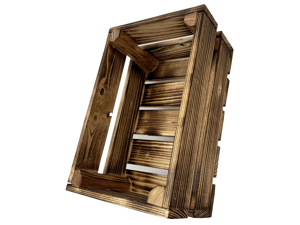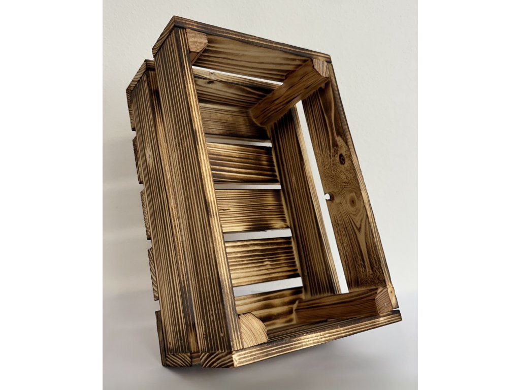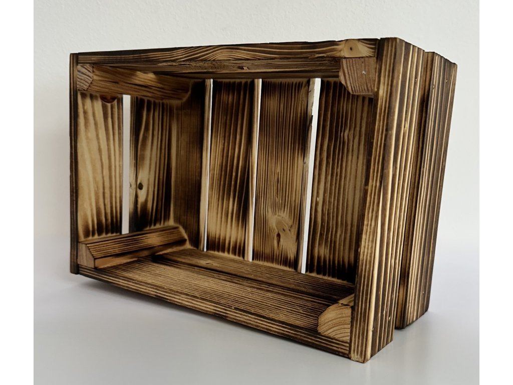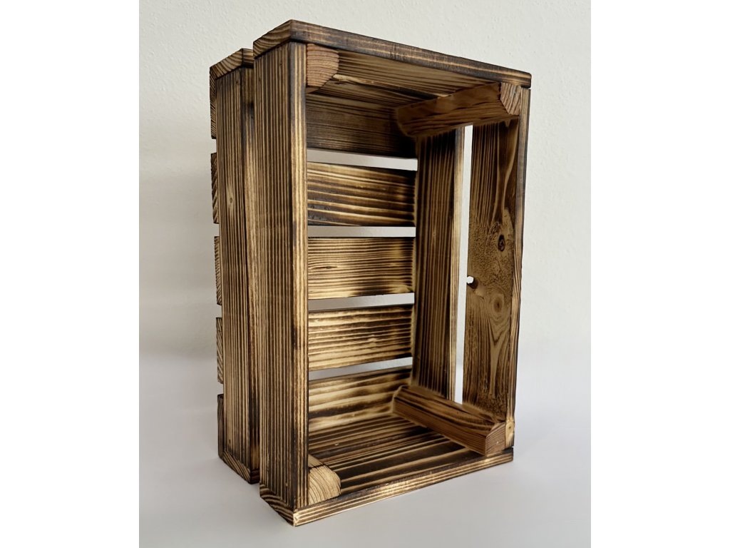 Stylová dřevěná bedýnka o rozměrech 27 × 18 × 12 cm je vyrobená z kvalitního masivu a povrchově upravená opalováním, které zvýrazňuje strukturu dřeva a dodává jí jedinečný rustikální vzhled.