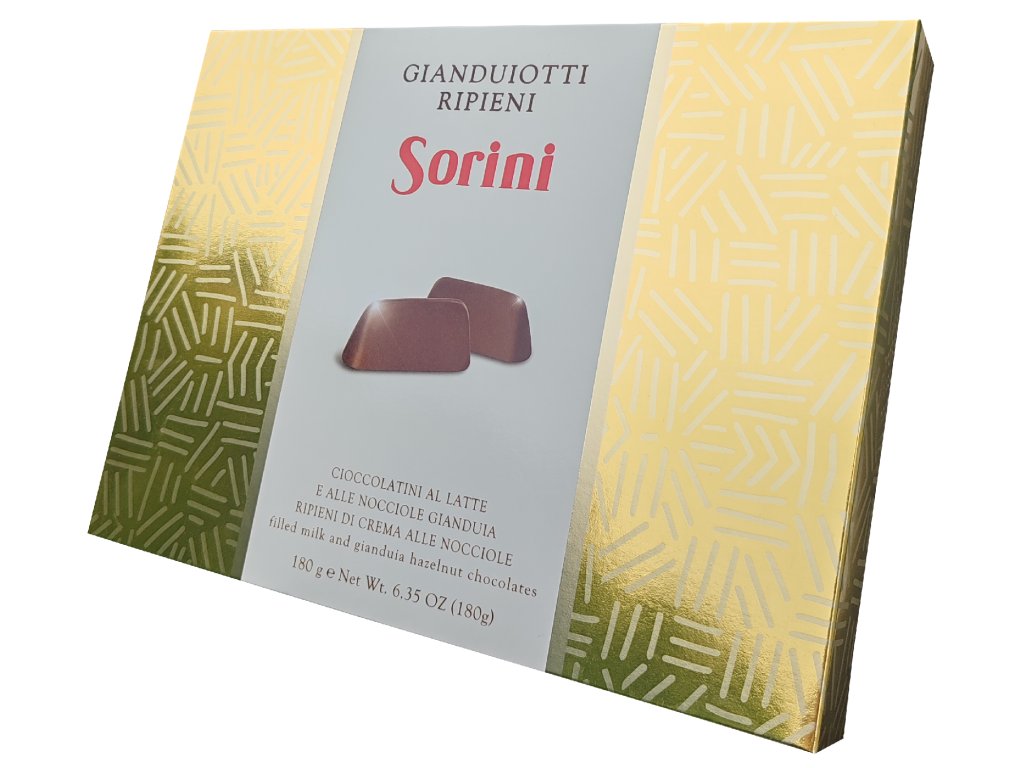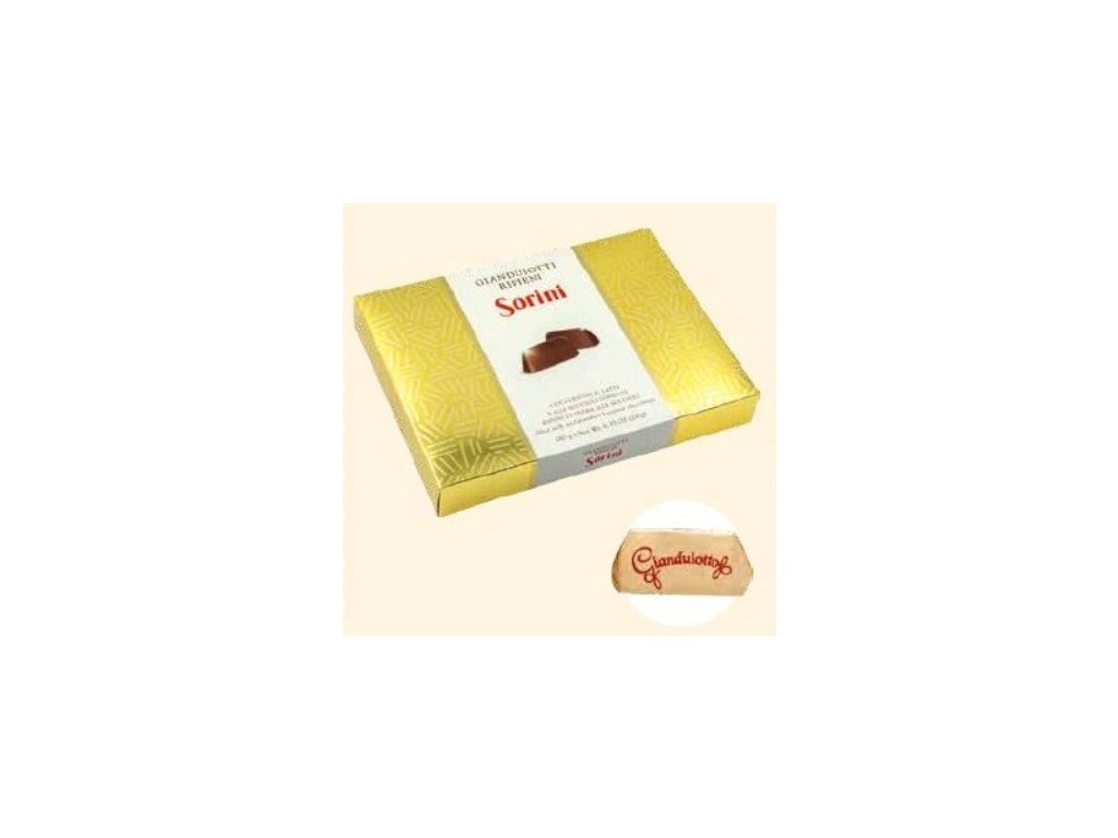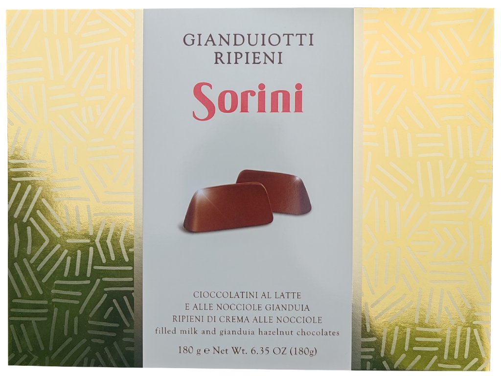 Složení: cukr, LÍSKOVÉ OŘECHY 10,8 %, kakaové máslo, rostlinné tuky v různém poměru (kokosový, z palmových jader, palmový, palmový), kakaová hmota, sušené plnotučné MLÉKO, sušená MLÉČNÁ SYROVÁTKA , kakaový prášek se sníženým obsahem tuku, sušené odstředěné MLÉKO, emulgátor: SÓJOVÝ lecitin, aromata. Může obsahovat jiné skořápkové plody. Čokoláda Gianduia: kakaová sušina 24% min. – mléčná sušina 11% min..