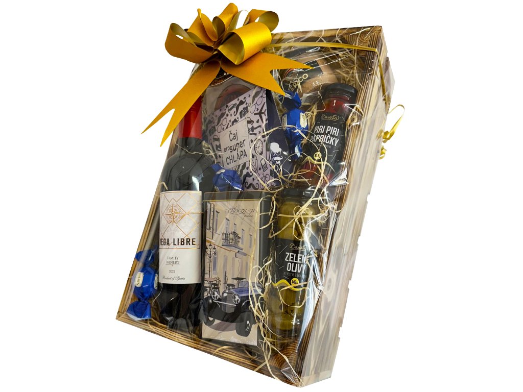 Originální dárkový balíček v pevné dřevěné bedýnce o rozměrech 40 × 25 × 12 cm nabízí kombinaci sladkého i slaného potěšení. Najdete v něm například výběr kvalitních italských pralinek Sorini, dárkově balený čaj, šéfíkovo koření a delikatesní španělskou paštiku Ibérico z oblasti Katalánska.