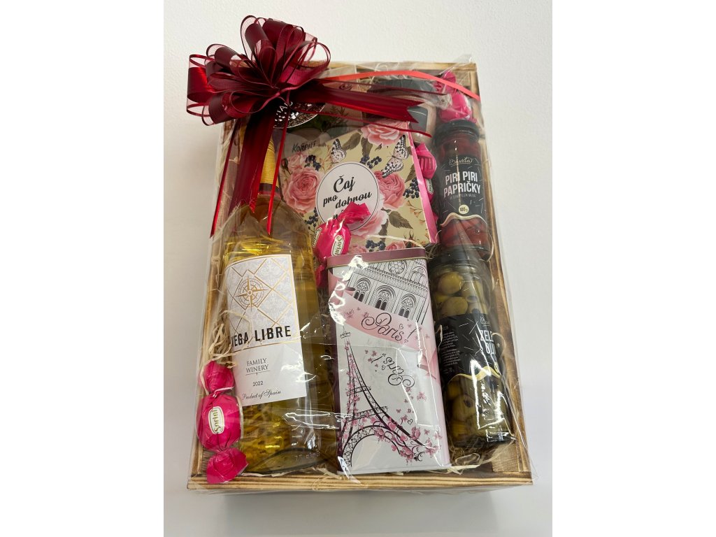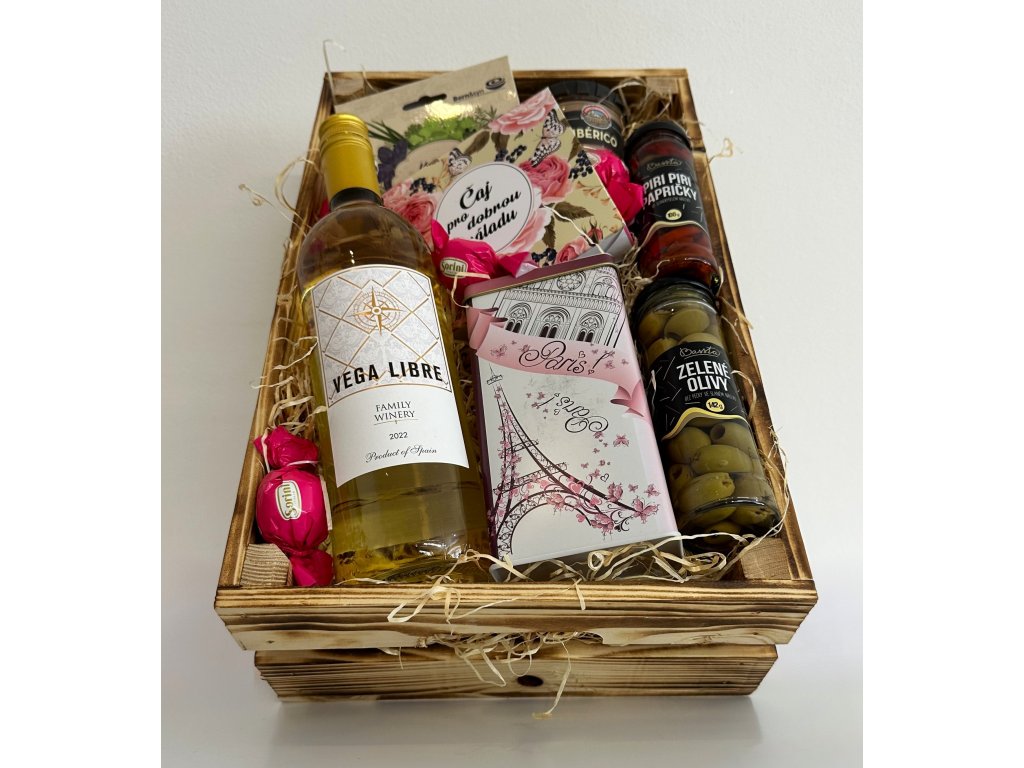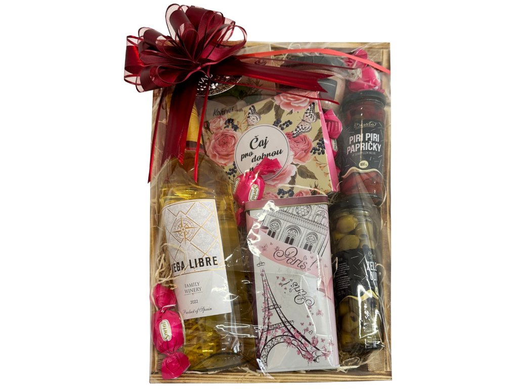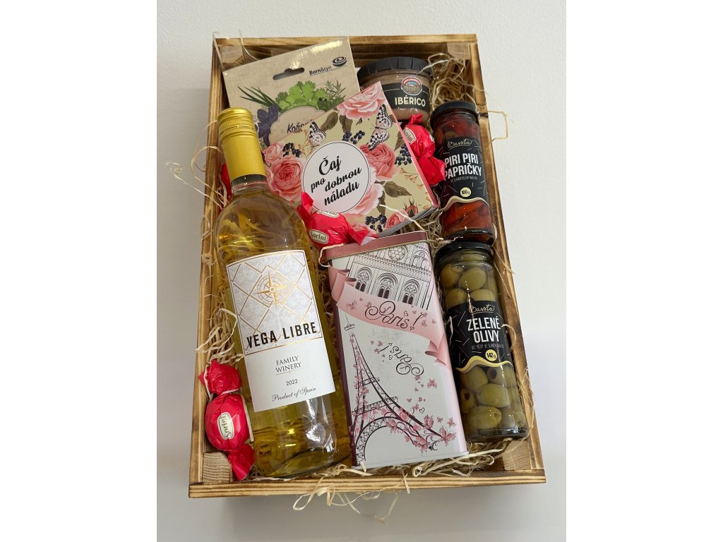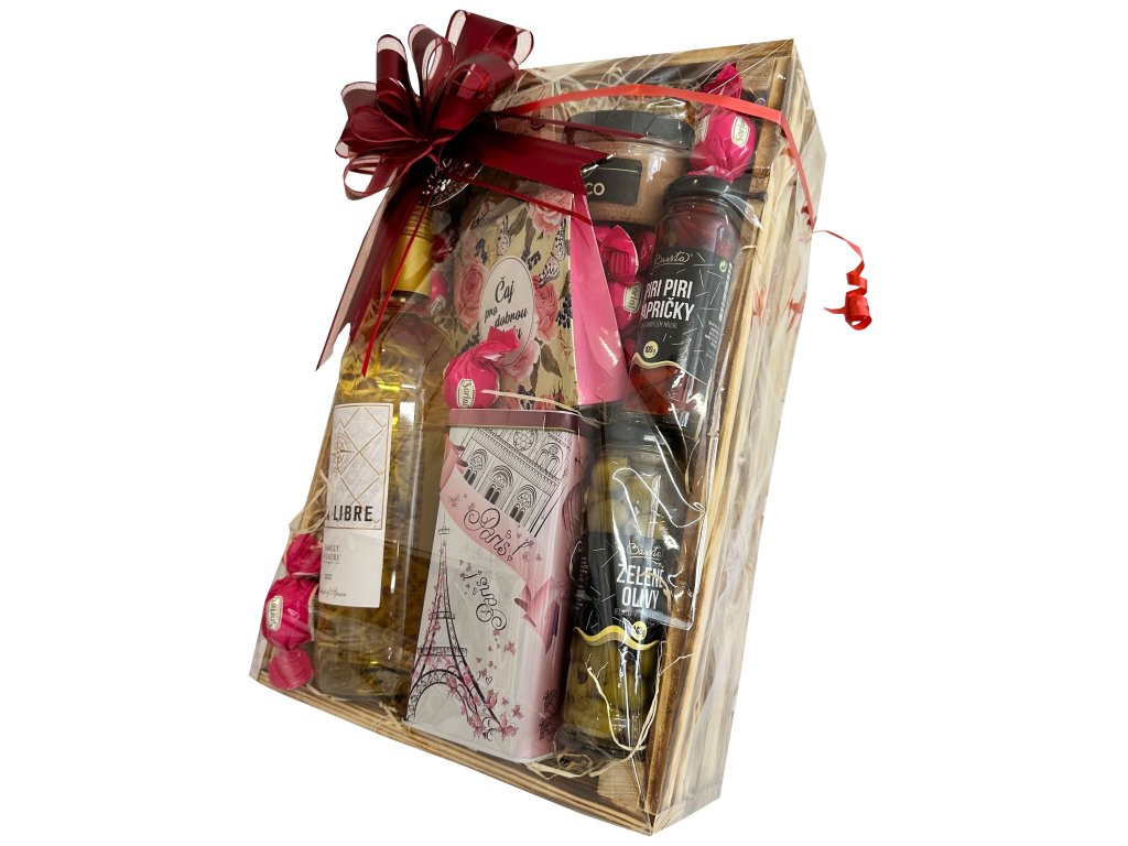 Originální dárkový balíček v pevné dřevěné bedýnce o rozměrech 40 × 25 × 12 cm nabízí kombinaci sladkého i slaného potěšení. Najdete v něm například výběr kvalitních italských pralinek Sorini, dárkově balený čaj, koření Jen pro tebe a delikatesní španělskou paštiku Ibérico z oblasti Katalánska.